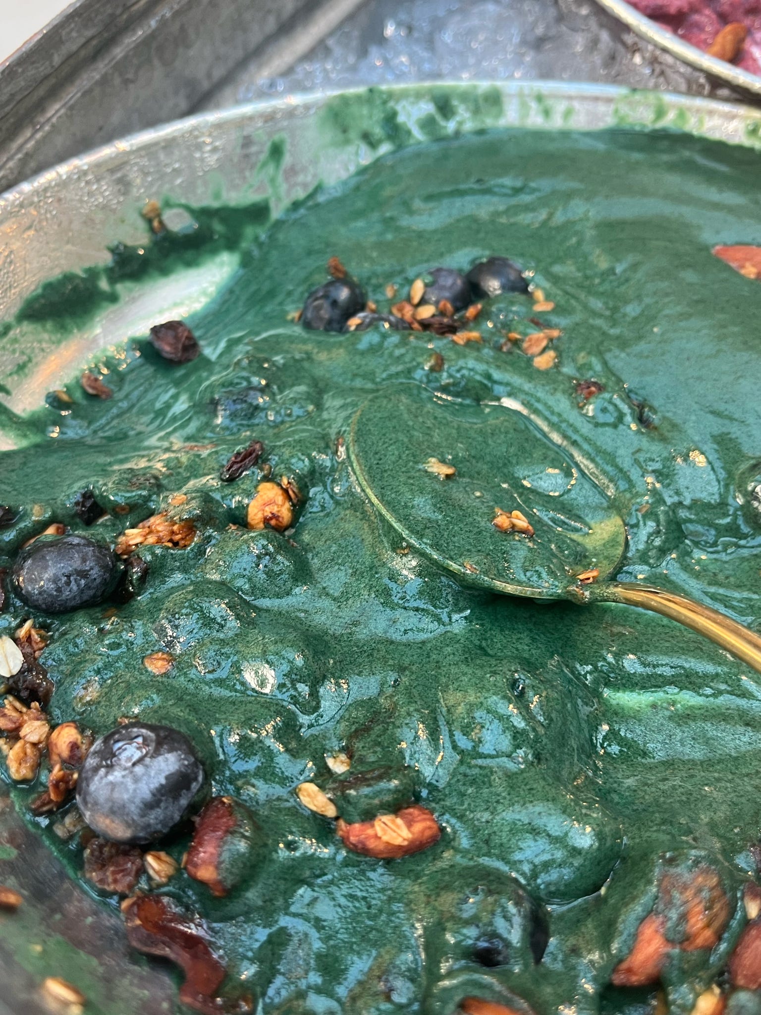 Pankek’ime eşlik edecek egzotik bir şeyler arıyordum. Çeşitliliğin büyüsünden dolayı hemen ilk gördüğümü tabağın yanına iliştirmek istemiyorum. Açık büfede olmanın tatlı gerginliği üzerimde, gözümle bütün ürünleri turlamaya çalışıyorum. Barın sonunda yemyeşil, yoğun ve yumuşak kıvamlı bu bowl’u gördüm. İlk düşündüğüm şey ne kadar ‘performatif’ bir yiyecek olduğuydu. Tamam anladık, en sağlıklı sensin.